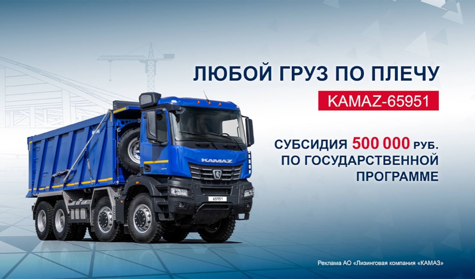 В «Лизинговой компании «КАМАЗ» для самосвальной техники разработано специальное предложение «Любой груз по плечу», срок действия которого рассчитан на 60 месяцев. Основные преимущества продукта – государственная субсидия от Министерства промышленности и торговли РФ 500 тыс. рублей на каждый приобретаемый автомобиль и сниженные на 50% первые два платежа. Также в числе достоинств программы – внесение аванса от 0%; увеличенный размер выкупного платежа – до 15%; перерасчет суммы договора лизинга при снижении ключевой ставки Банка России. При повышении ключевой ставки сумма договора не пересчитывается. Страхование КАСКО по ставке 1,6%. Программа действует до 31 декабря 2025 года.