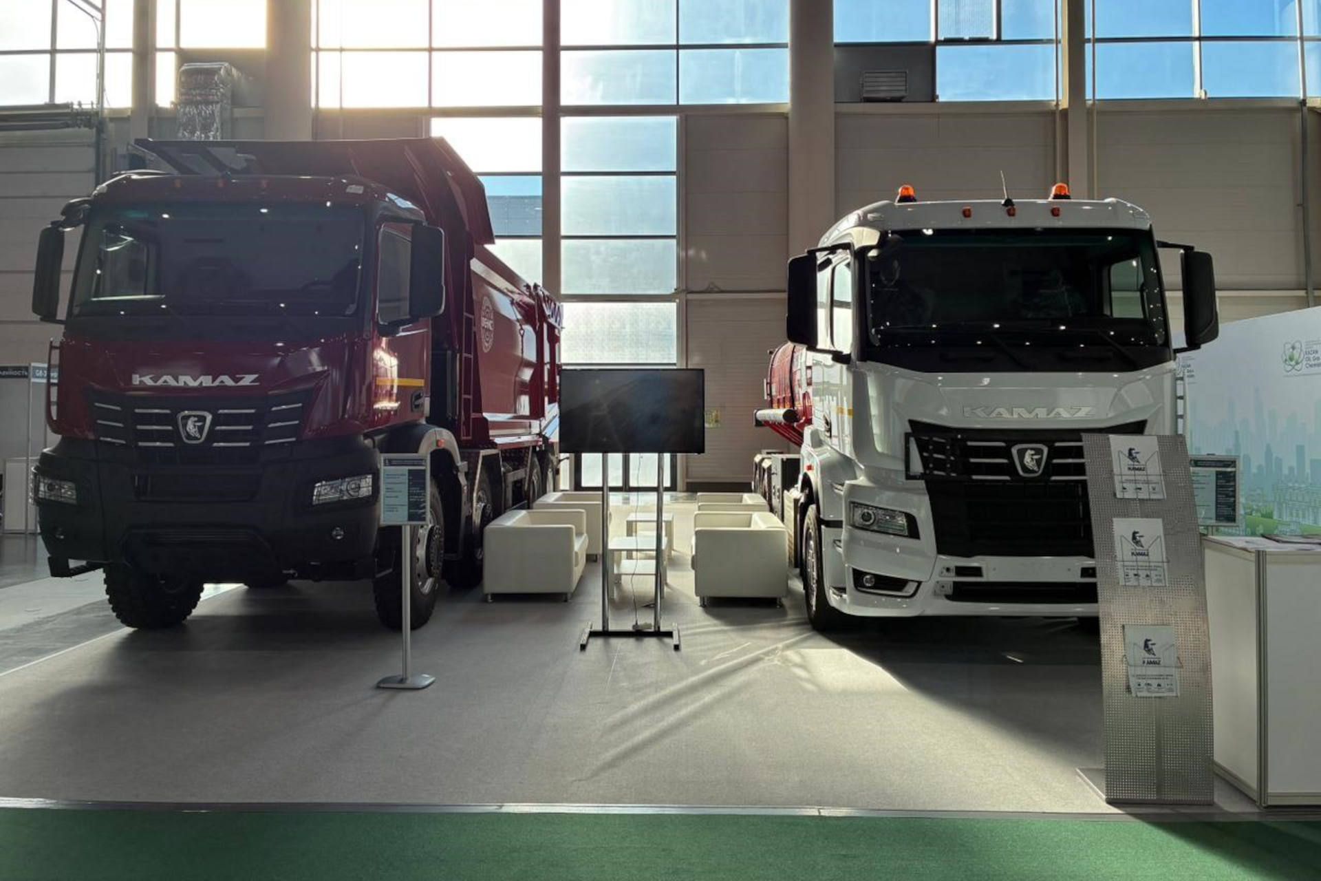 На стенде демонстрируется автоцистерна на шасси КАМАЗ-65658, предназначенная для транспортирования, кратковременного хранения светлых нефтепродуктов (дизтоплива). При этом автомобиль соответствует требованиям ДОПОГ (соглашения о международной дорожной перевозке опасных грузов). Объём автоцистерны составляет 15, 5 куб.м, тип сечения – «чемодан». Данная модель оснащена экономичным двигателем мощностью 390 л.с. и 12-ступенчатой роботизированной коробкой передач. Комфортабельная кабина оснащена спальным местом.