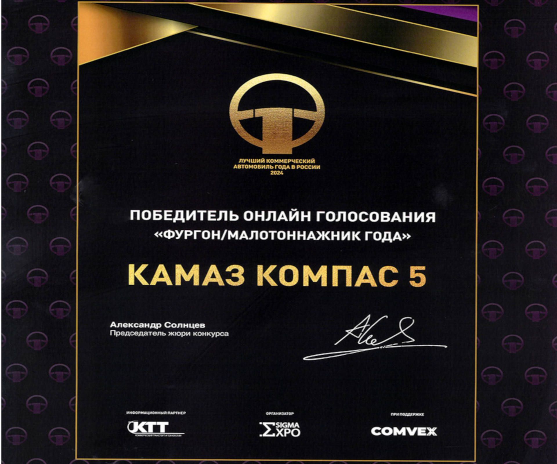 Автомобиль КАМАЗ Компас 5 стал победителем конкурса «Лучший коммерческий автомобиль года в России-2024» в номинации «Фургон / Малотоннажник года».