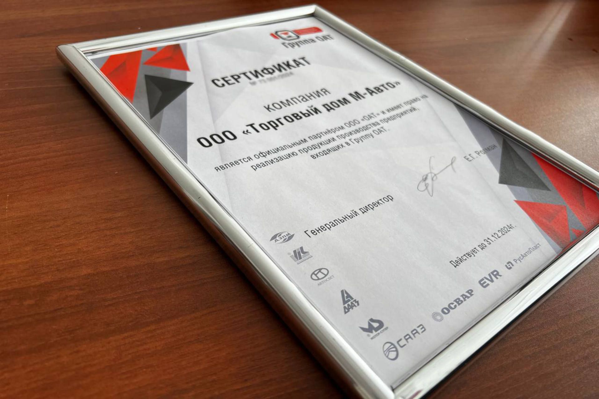 Данный сертификат выдаётся компаниям, которые являются официальными партнёрами ООО «ОАТ» и имеют право на реализацию продукции производства предприятий, входящих в Группу ОАТ. Как отмечают дилеры, выдача таких сертификатов – хорошая практика, которая в том числе служит подтверждением доверия к данному партнёру по реализации оригинальной продукции Группы ОАТ.